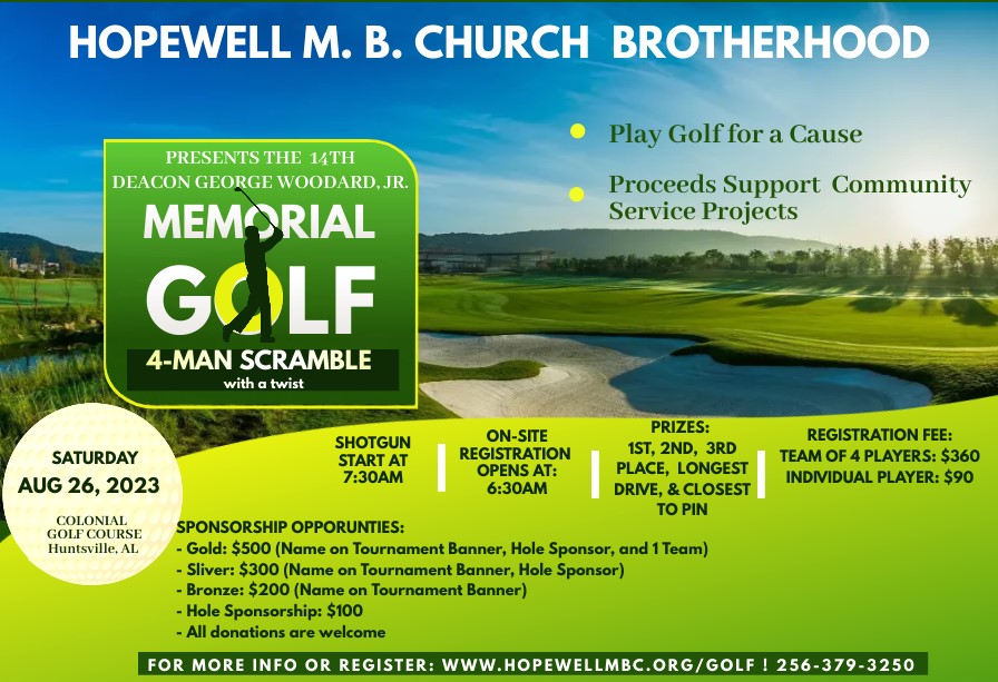 The 2024 Brotherhood Retreat will be held on September 6-7, 2024 at the Vision Retreat Center in Huntsville. The cost to attend is $140 per person, sponsorships are available. Registration is now open, to register and or pay click here. For more information, please email brotherhood@hopewellmbc.org.